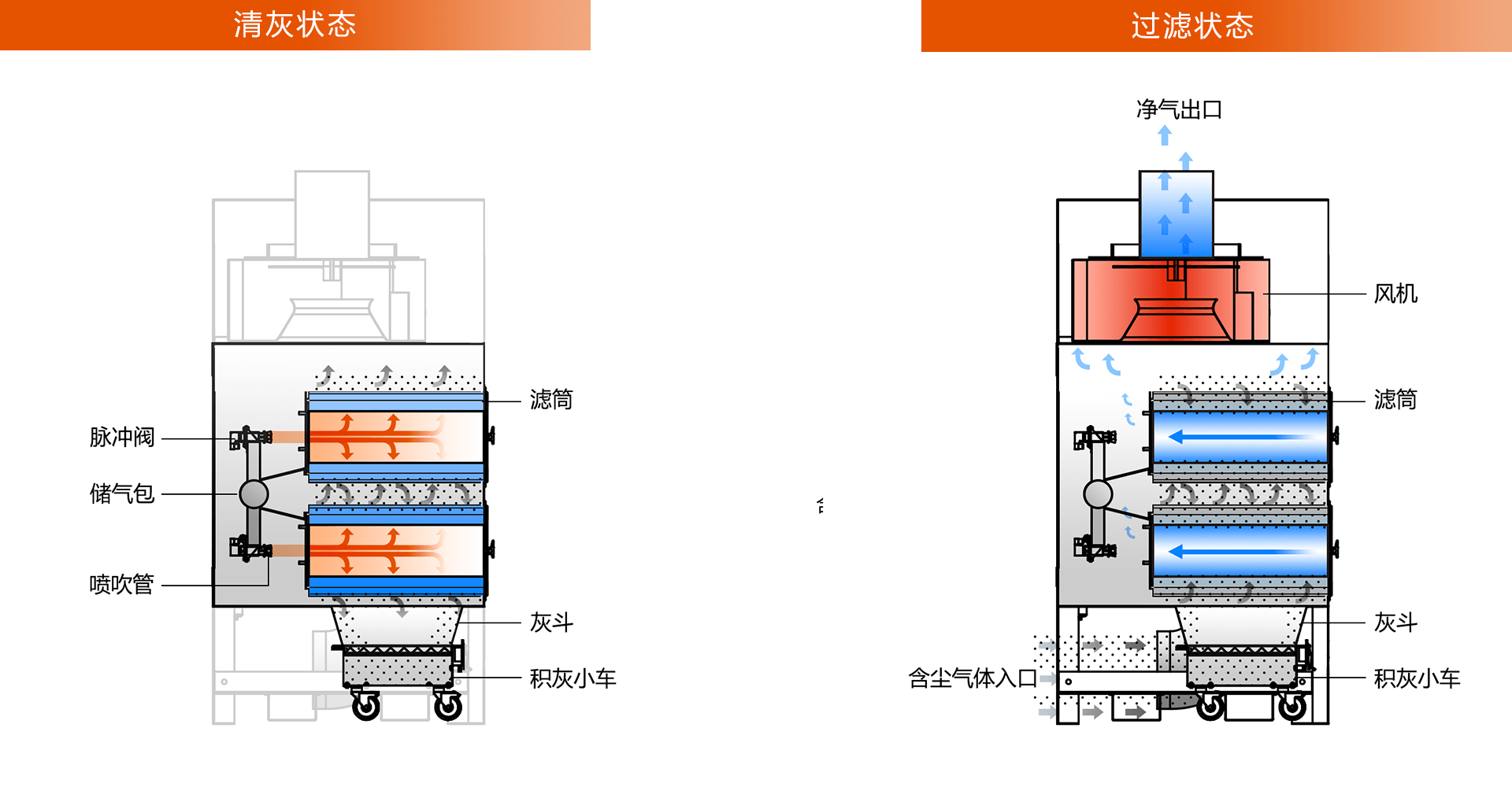 通过反复小幅度的冲击振动,将积聚在滤筒外部的粉尘震落至灰斗内。
